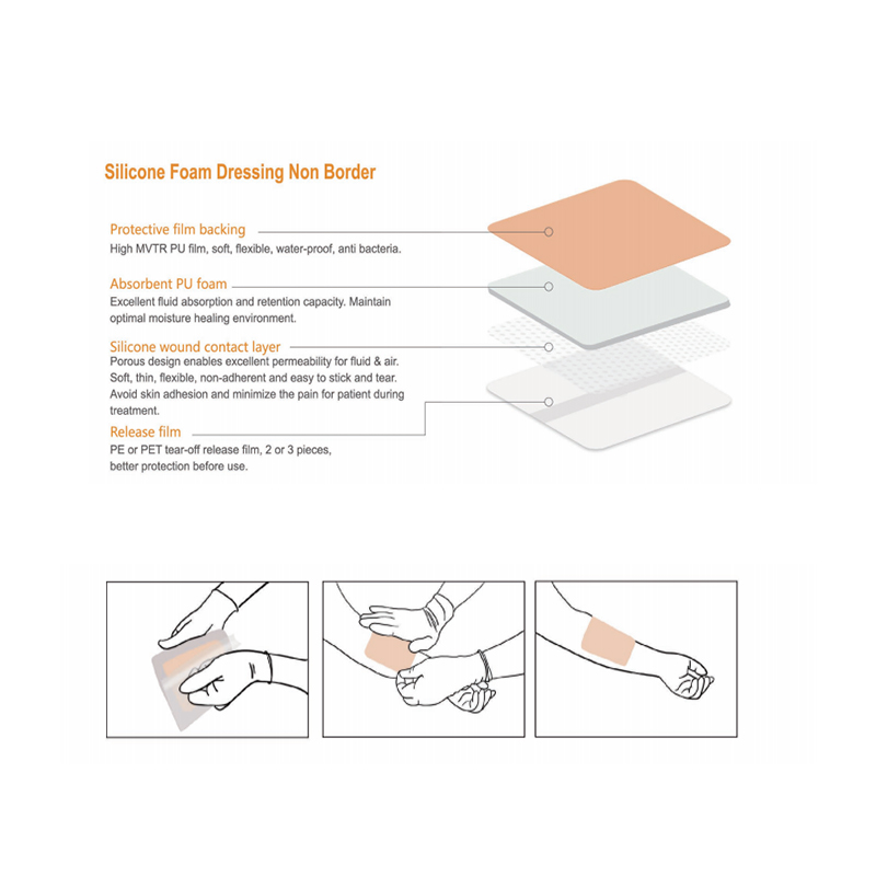 Ubegrenset silikonskumbandasje er selvklebende bandasje bestående av beskyttende filmbakside, absorberende PU-skum, silikonsårkontaktlag og frigjøringsfilm. Den brukes hovedsakelig til kroniske og akutte sår med moderat til høy væskedannelse, og brukes også til forebygging og behandling av trykksår.