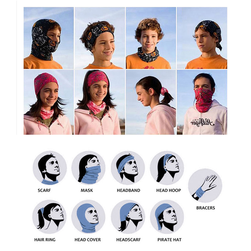 Bruksområde: Kan brukes som hodeskjerf, skjerf, sandmaske, armbånd, hårbelte, etc.