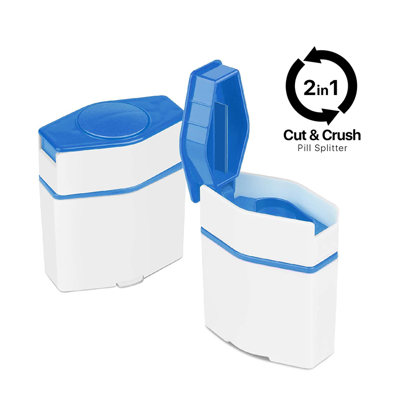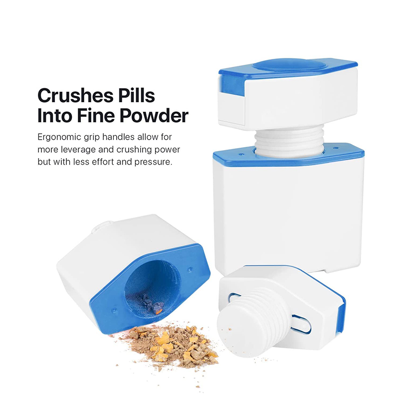 Den knuser pillene til fint pulver, bruker et blad i rustfritt stål for å dele pillene riktig, og lagre de kuttede og ukuttede kapslene på forhånd.