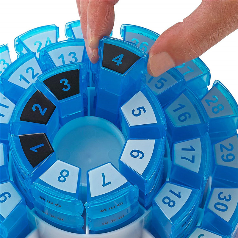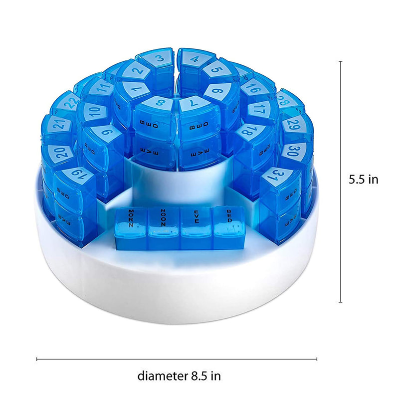 Den sirkulære designen gjør det også mulig for mens-pille-organisatoren å enkelt legge på en benkeplate, samtidig som du kan ta med deg hver dag medisiner uansett hvor du går!