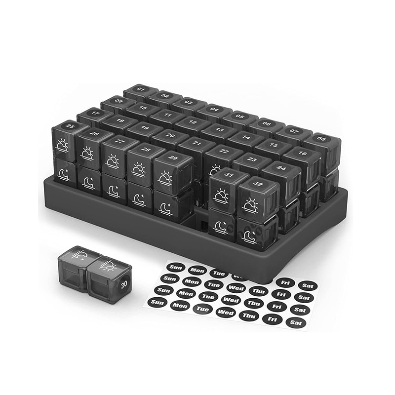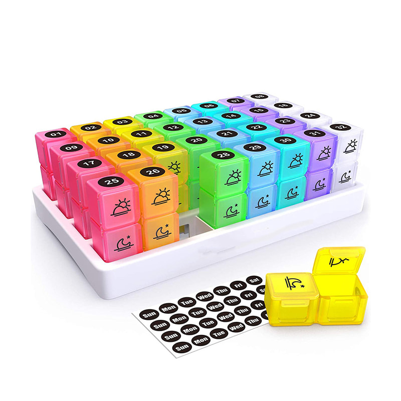 Vår 31-dagers månedlige pille-arrangør har 32 nummererte lyse og fargerike gjennomskinnelige individuelle pillebokser som du vil kunne sjekke for å se om du har tatt pillene for dagen, og på den måten slipper du å ha flere pillebokser.