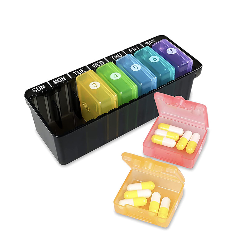 7 individuelle fargerike pillebokser lar deg ta en du trenger for dagen og legge den i vesken eller lommen.