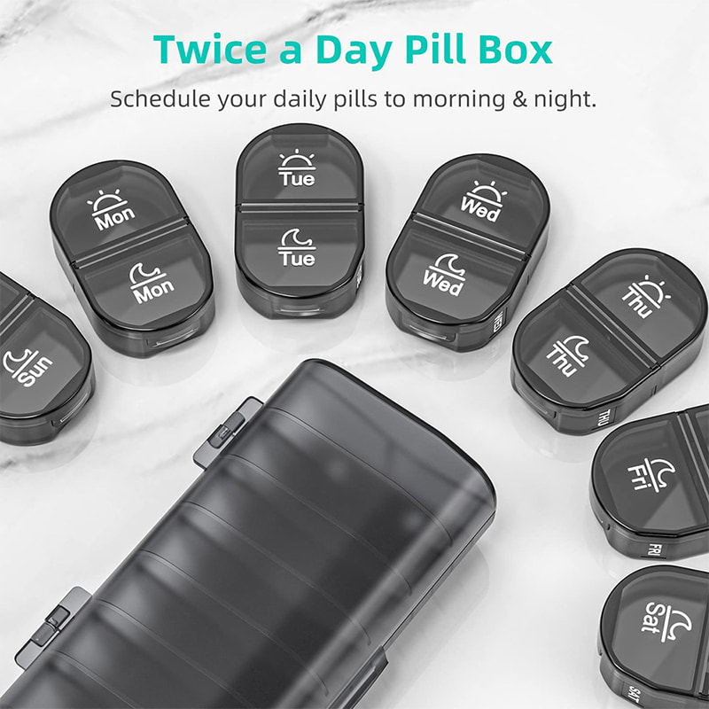 Hvert rom har AM/PM morgen kveld deler. Denne pilleboksen hjelper deg med å holde oversikt over pillene og kosttilskuddene dine.