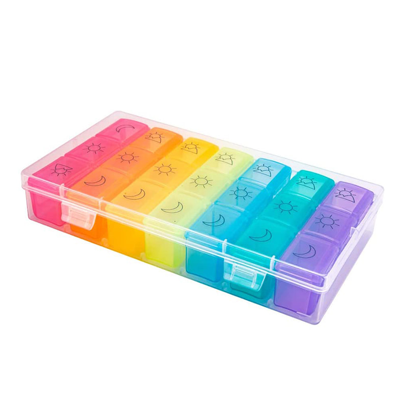 Lys farge på den individuelle indre pilleboksen tilsvarer én dag i uken