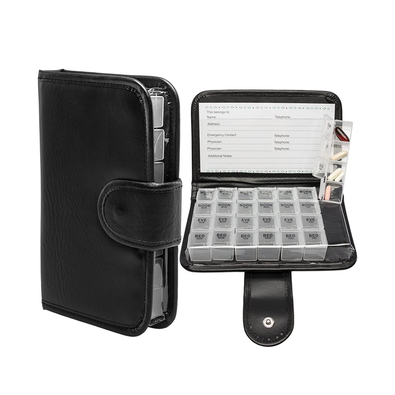 En flott reisepille-arrangør, vitamindispenser. medisinpåminnelse for bil- eller flyturer, ferier.