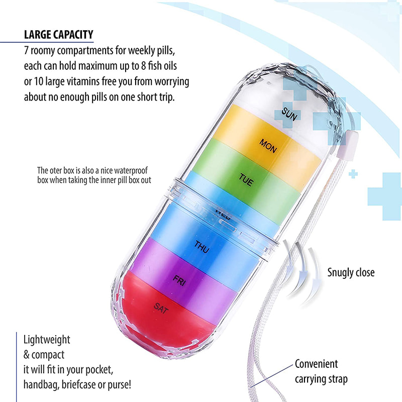 1 ytre beholder med stropp og 7-dagers individuelle etuier for å unngå utilsiktet søl og holde medisiner trygge, tørre og borte fra fuktig. åpnes ikke automatisk når den trykkes. Tauet festet til settet gjør det enkelt å bære.