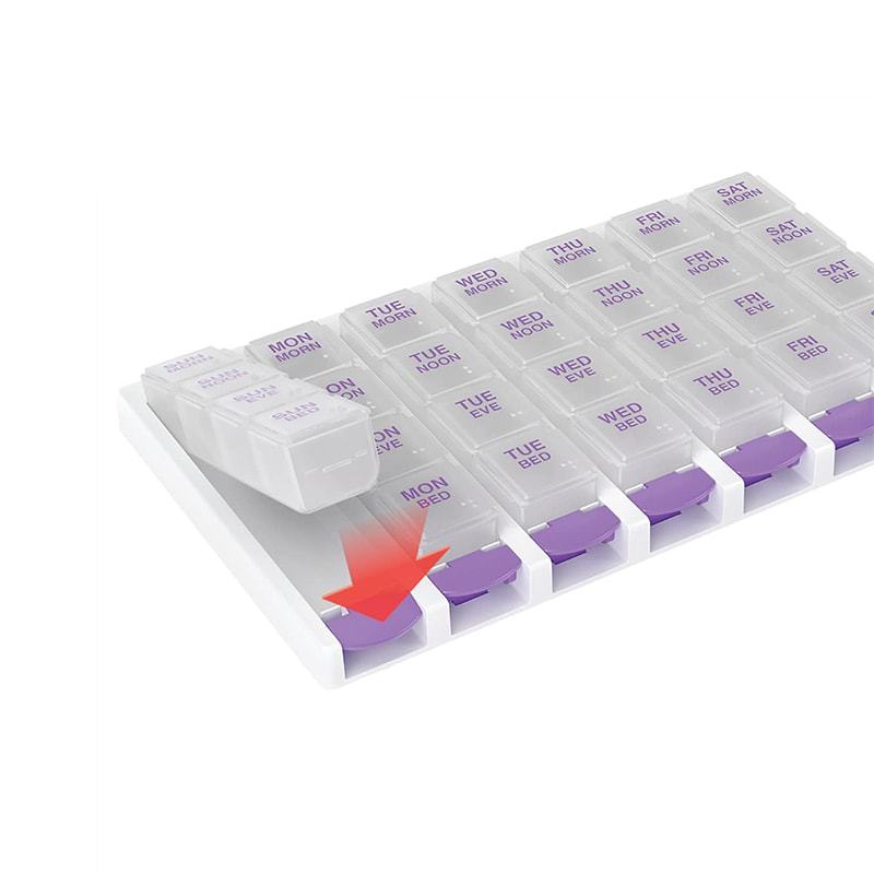 ENKEL BRUK: Trykknapper og avrundet bunn, gjør pillebeholderen enkel å åpne og medisiner lett å hente