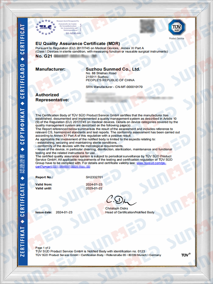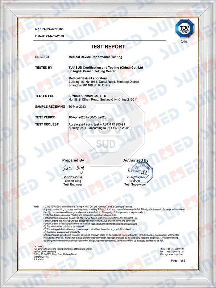 Sunmed har et profesjonelt kvalitetskontrollteam som består av hundrevis av personell som nøye følger inspeksjonsprosedyrene for å sikre at vi oppfyller ISO13485:2016-standardene. De fleste av produktene våre er CE-sertifisert, og Suzhou-fabrikkene våre overholder FDA-kravene.
