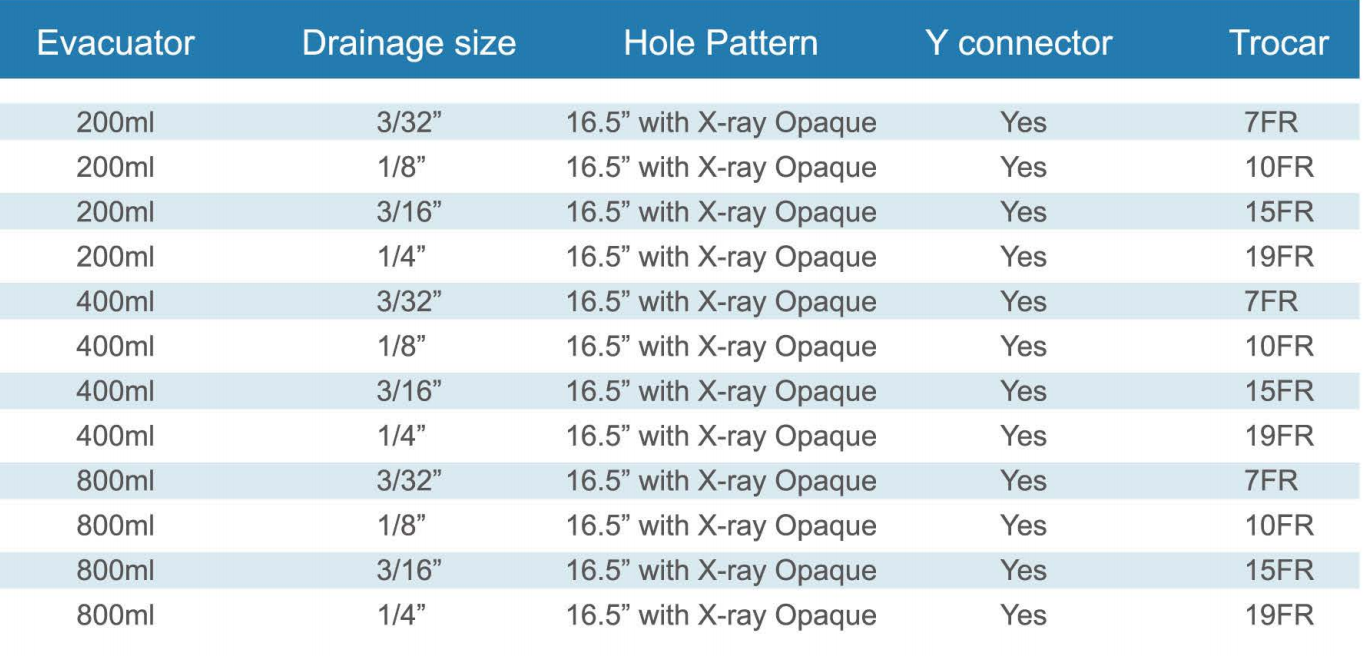 * Vårt lukkede sårdreneringssystem, inkludert 400cc3-fjærevakuator,·PVC-slange og "Y"-kobling, og drenering med trokar.